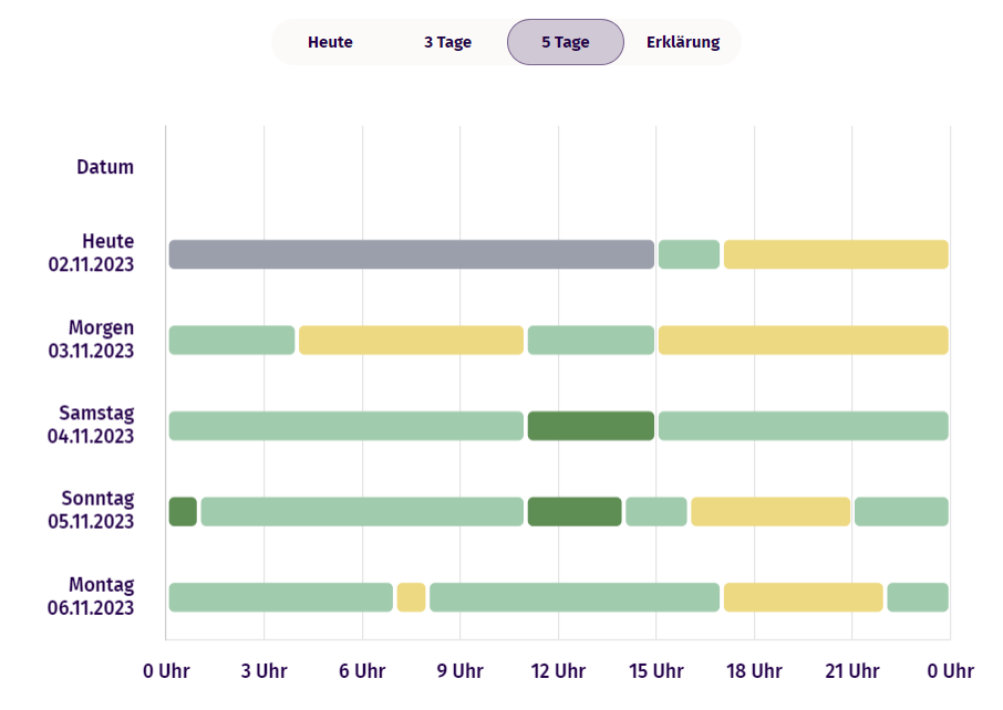 LADE Green Energy Forest shows availability of renewable energy in the grid up to five days in advance. This way, it helps placing managebale power consumption at these times specifically.