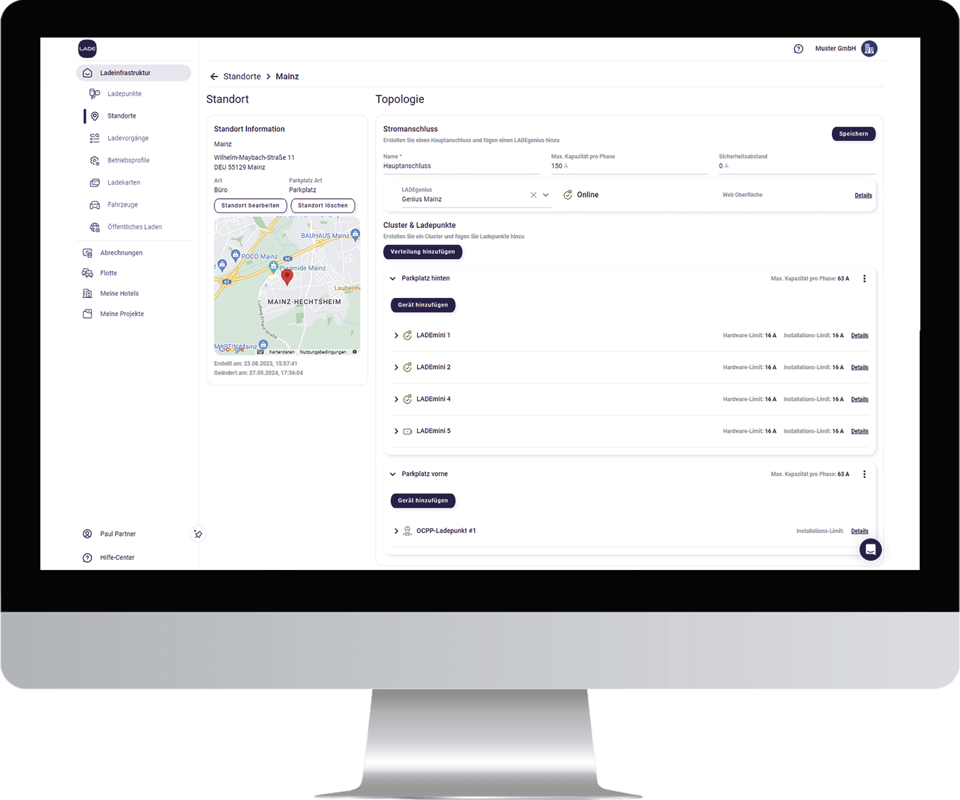 - Inkl. KI-basiertem Lastmanager LADEgenius zur Vermeidung von Lastspitzen und für kostenoptimiertes Laden